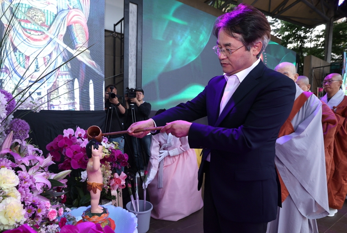 | ▲ 이동환 시장이 불상에 물은 끼얹고 있다. (번민을 씻어내는 의식) |