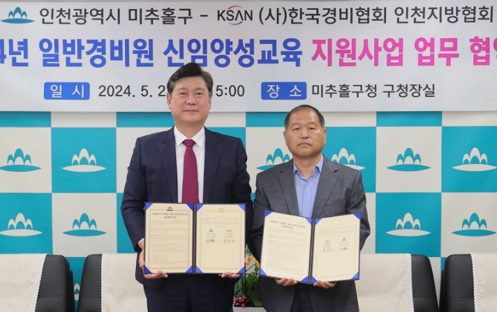[뉴스서울] 인천 미추홀구는 23일 구청장실에서 (사)한국경비협회 인천지방협회와 ‘2024년 일반경비원 신임양성교육 업무협약’을 체결했다.