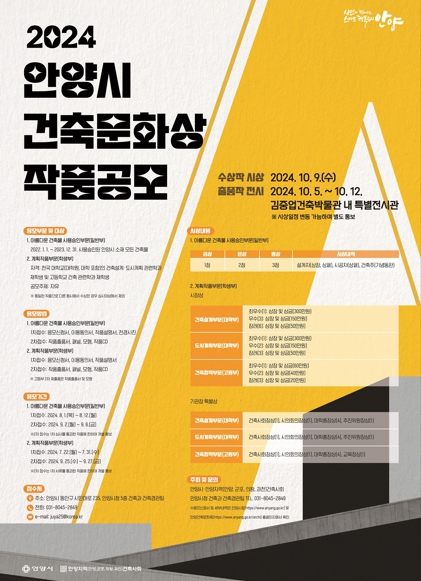 [뉴스서울] 안양시는 ‘2024년 안양시 건축문화상’에 참여할 작품을 공개 모집한다고 20일 밝혔다.