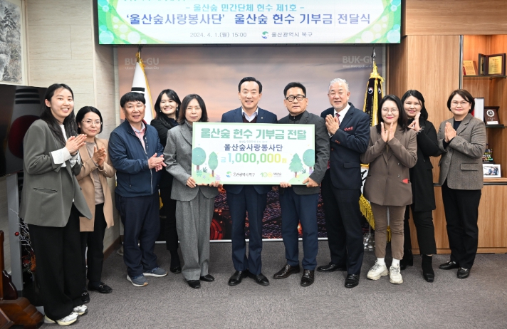 북구는 이날 구청장실에서 울산숲 민간단체 제1호 헌수 기부금 전달식을 열고, 울산숲 헌수에 동참한 울산숲사랑봉사단에 감사의 뜻을 전했다.