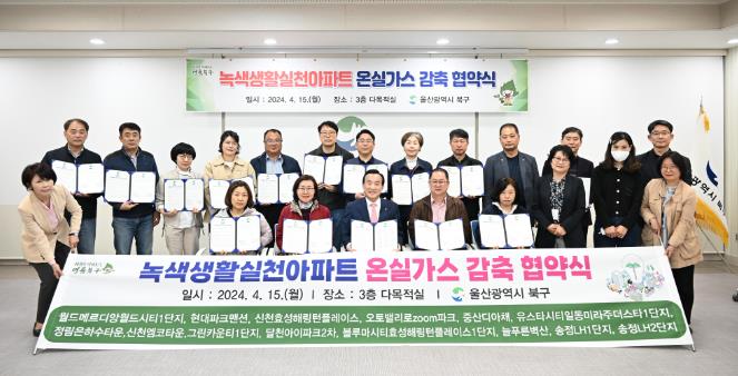 [뉴스서울] 울산 북구는 15일 다목적실에서 북구 지역 150세대 이상 14개 공동주택과 녹색생활실천 온실가스 감축 협약을 체결했다.