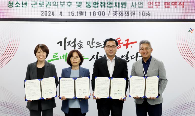 [뉴스서울] 대전 동구는 대전 자치구 중 처음으로 대전지방고용노동청을 비롯한 4개 기관이 청소년의 근로 권익 보호와 통합 취업 지원 사업을 공동으로 추진하기 위해 업무 협약을 맺었다고 15일 밝혔다.