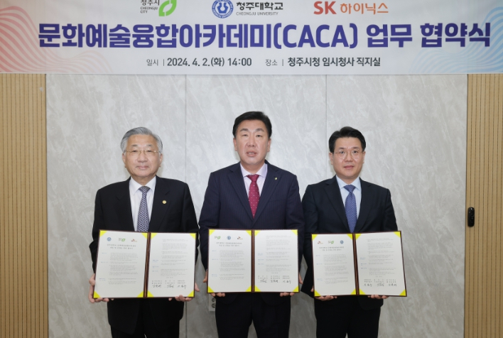 청주시는 2일 임시청사 직지실에서 문화예술융합아카데미(Culture and Arts Convergence Academy, 이하 CACA 사업) 추진 협력을 위해 청주대학교, SK하이닉스와 업무 협약을 체결했다.