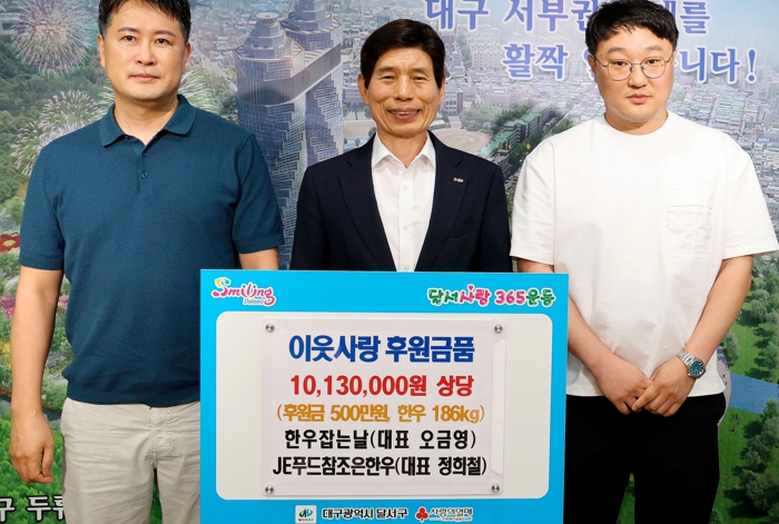 [뉴스서울] 대구 달서구가 19일 한우잡는날, JE푸드참조은한우로부터 관내 취약계층 주민들에게 지원해달라며, 이웃사랑 후원금품 1,013만원을 기탁받았다