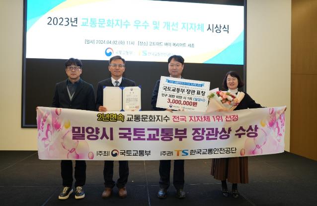 [뉴스서울] 밀양시는 2일 한국교통안전공단에서 개최한‘2023년 교통문화지수 우수 및 개선 지자체 시상식’에서 국토교통부 장관 표창을 받았다고 밝혔다.