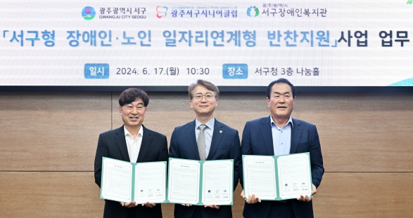 [뉴스서울] 광주광역시 서구가 장애인‧노인 공공일자리 협업을 통해 복지 사각지대 해소에 나선다. 서구는 17일 서구청 나눔홀에서 광주서구시니어클럽, 광주광역시 서구장애인복지관과 서구형 장애인-노인 일자리 연계형 반찬지원사업 업무협약을 체결했다.