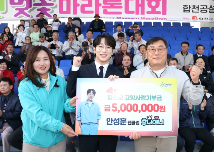 군은 벚꽃마라톤대회가 열린 합천공설운동장에서 미스터트롯 시즌2 진(眞)을 수상한 트로트 가수 안성훈씨를 홍보대사로 위촉했다. 안성훈 팬클럽 후니애니(회장 서연희) 회원들은 홍보대사 위촉을 기념해 팬클럽 회원들이 십시일반 모은 5백만원을 가수 안성훈의 고향 합천에 기탁하며 건전한 기부문화에 앞장서는 팬 문화를 보여줬다.