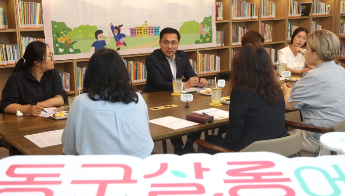 ‘아이 키우기 좋은 동구 이렇게 만들어요’를 주제로 진행된 이날 간담회에서는 온라인 사전 신청으로 모집한 관내 초등학생 학부모 8명과 박 청장이 편안한 분위기에서 격의 없는 대화와 소통의 시간을 가졌다.