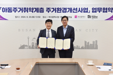 [뉴스서울] 부산시는 오늘(20일) 오후 1시 30분 시청 국제의전실에서 사단법인 한국해비타트와 함께 '아동주거취약계층 주거환경개선사업' 추진을 위한 업무협약을 체결한다고 밝혔다.