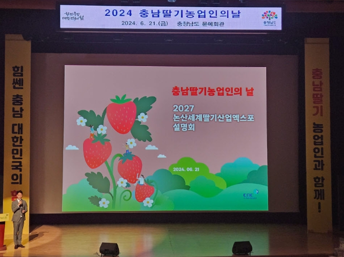 [뉴스서울] 논산시(가 21일 11시 충남도청 문예회관에서 열린『'024 충남 딸기 농업인의 날' 행사에서 ‘2027 논산세계딸기산업엑스포’ 개최계획의 요점을 도내 딸기 농업인과 공유했다.