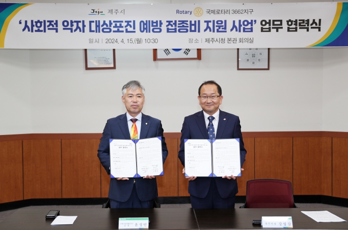 [뉴스서울] 제주시는 4월 15일 시청 본관 회의실에서 국제로타리3662지구와 ‘사회적 약자 대상포진 예방 접종비 지원 사업’ 업무 협력을 체결했다.