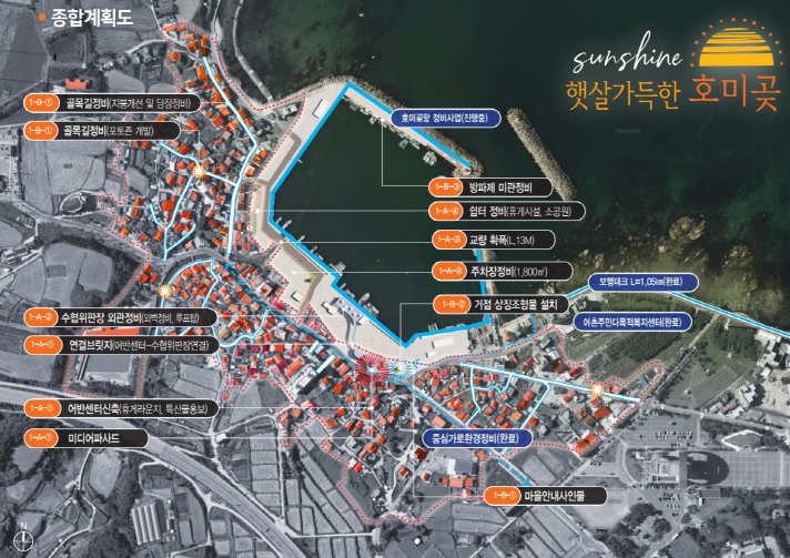 포항시는 특산물 홍보, 마을안내소, 휴게공간이 함께 어우러진 ‘어반센터 신축’과 호미곶항 주변 경관을 정비하기 위한 ‘방파제 미관개선 및 쉼터 조성’, 방문객 편의를 위한 주차장 정비 등 기초생활기반 확충 사업과 지역주민들의 소득증대를 위한 지역공동브랜드 개발, 미디어플랫폼 개발 등의 지역역량강화사업을 추진할 방침이다.