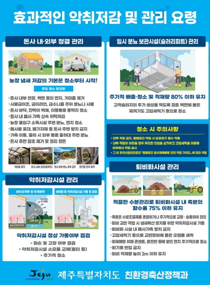 한편, 제주도는 올해 실효성 있는 양돈장 악취 저감을 위해 양돈장 악취관리 수준진단 및 전문가 컨설팅·이행 점검, 시설 현대화·악취저감시설 설치 지원, 가축분뇨 고착슬러지 제거, 정보통신기술(ICT) 활용 악취측정 기계·장비 설치, 축산환경 개선교육(‘24. 4월), 민원다발지역 지도·점검 등 양돈농가 맞춤형 정책 등을 추진 중이다.