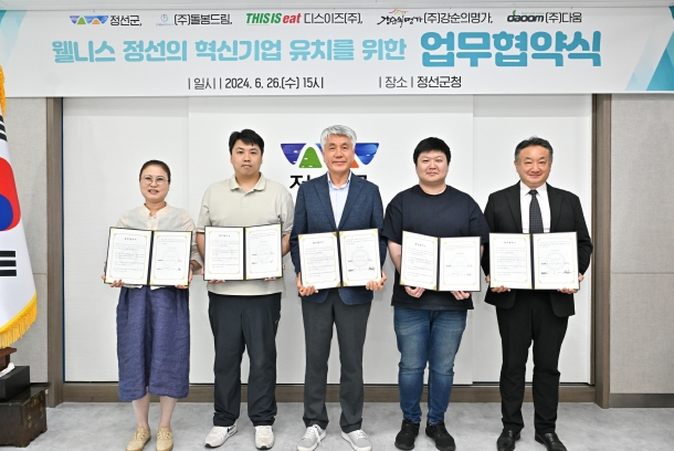이날 협약식은 최승준 정선군수를 비롯한 이상만 전략산업과장, 김지훈 ㈜돌봄드림 대표, 김원태 디스이즈(주) 대표, 이점희 ㈜강순의 명가 대표, 김형서 ㈜다움 대표 및 관계 공무원 등 10여 명이 참석한 가운데 정선군 이전 희망 기업의 투자계획 이행, 경영안정을 위한 행정적·재정적 지원, 지역 생산 농산물 수매 및 지역주민 고용 등에 관한 내용이 담긴 협약을 체결했다.
