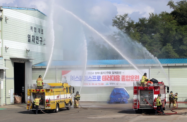 이번 훈련은 방위산업체 테러 대응 종합훈련으로 후방지역 교란을 위해 침투한 적 특수부대에 의해 ㈜스페이스프로 제2공장에 화재가 발생하고 인명피해가 속출하는 상황을 가정해 △군·경의 초동 조치 및 테러 진압 △소방의 인명구조 및 화재진압 △한전, KT, 밀양시의 피해시설 응급 복구 활동 순으로 진행됐다.