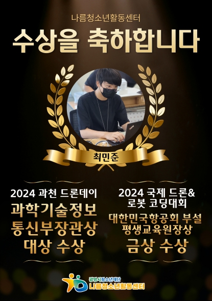 나름청소년활동센터 소속 최민준 청소년은 2023년부터 과학에 대한 관심을 갖고 드론, 자동차 메이킹 프로그램 등 나름청소년활동센터에서 진행된 다양한 활동에 참여해왔으며, 이를 바탕으로 각종 과학 대회에 나가 우수한 성적을 거두었다.