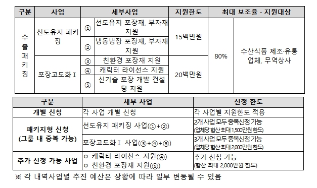 수산식품 수출업체당 최대 2,000만 원까지 ▲ 선도유지 포장재․부자재 ▲ 냉동·냉장 포장재․부자재 ▲ 친환경 포장재․부자재 ▲ 캐릭터 사용권 ▲포장재 개발 컨설팅 등 수출에 필요한 다양한 분야를 지원한다.