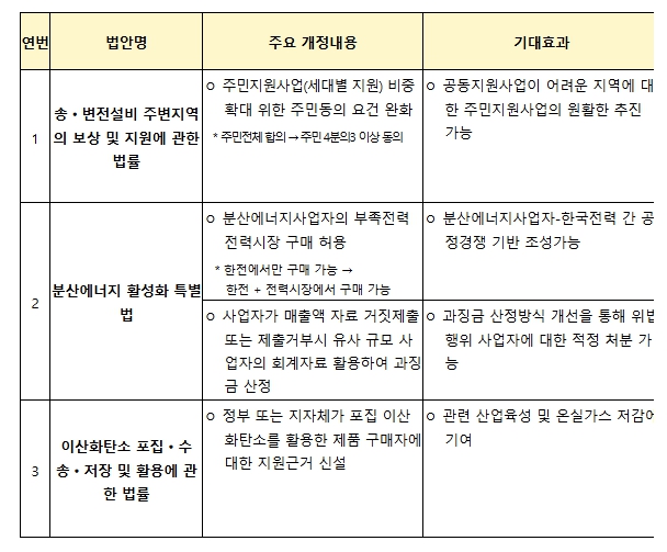 [뉴스서울] 기후에너지환경부는 △‘송‧변전설비 주변지역의 보상 및 지원에 관한 법률’, △‘분산에너지 활성화 특별법’ 등 3개 법 개정안이 11월 13일 국회 본회의를 통과했다고 밝혔다. 개정안별 주요내용은 다음과 같다.