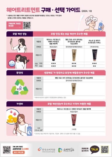 ‘케라시스 어드밴스드 리페어 피치로즈 앰플 헤어팩(애경산업㈜)’, ‘팬틴 프로-브이 씻어내는 트리트먼트 콜라겐 극손상케어(한국피앤지판매유한회사)’ 등 2개 제품은 모발의 엉킴과 보습 개선성능이 모두 상대적으로 ‘우수’했다.