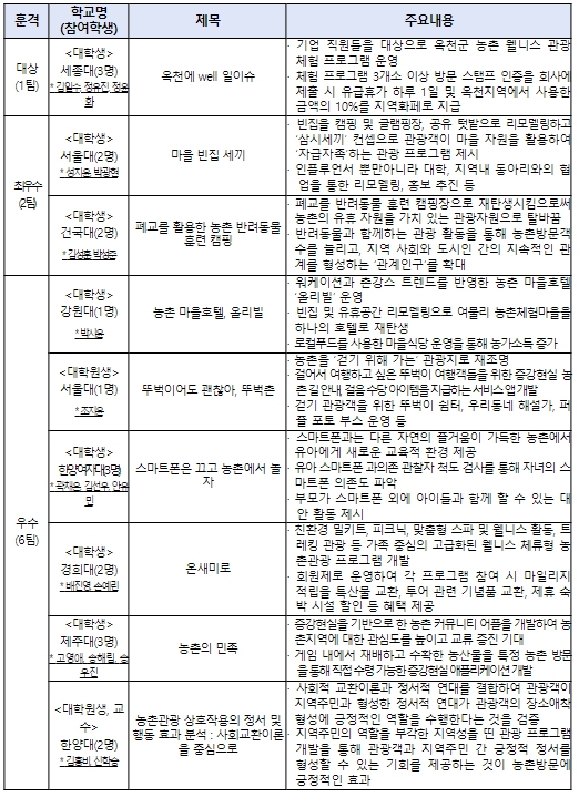 최우수상(2개팀)은 ①서울대학교 “마을 빈집 세끼”, ②건국대학교 “폐교를 활용한 농촌 반려동물 훈련 캠핑”이 선정되었다. 우수상(6개팀)은 ①강원대학교 “농촌 마을호텔, 올리빌”, ②서울대학교 “뚜벅이어도 괜찮아, 뚜벅촌”, ③한양여자대학교 “스마트폰은 끄고 농촌에서 놀자”, ④경희대학교 “온새미로”, ⑤제주대학교 “농촌의 민족”이 각각 선정되었으며, ⑥한양대학교 “농촌관광 상호작용의 정서 및 행동 효과 분석:사회교환이론 중심으로”가 우수 논문으로 선정되었다.