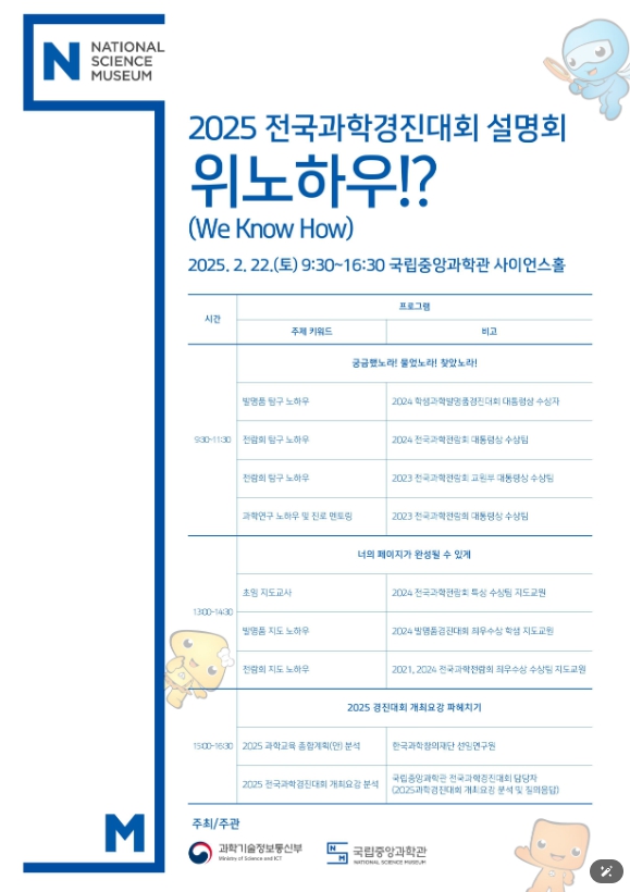 전국과학경진대회는 대한민국에서 가장 오랜 역사를 지닌 권위 있는 과학탐구 및 학생과학발명 대회로, 수많은 우수 과학 인재를 배출하며 대한민국 과학기술 발전에 기여해 왔다. 또한 과학이라는 도구를 활용하여 자신만의 진로를 개척해 나아가는 과학인들에게 전국과학경진대회는 하나의 기회이자 과정으로 오랜 시간 자리매김하였다. 다만, 오랜 역사와 권위로 인해 대회 참가에 망설임을 느끼는 이들에게 디딤판이 될 수 있는 기회를 제공하기 위해 준비한 이번 설명회에서 “위노하우 (We Know How)”라는 주제 아래 지난 경진대회 수상자 및 지도교사들의 경험을 공유하는 한편, 2025년도 대회 개최 요강을 상세히 안내할 예정이다.