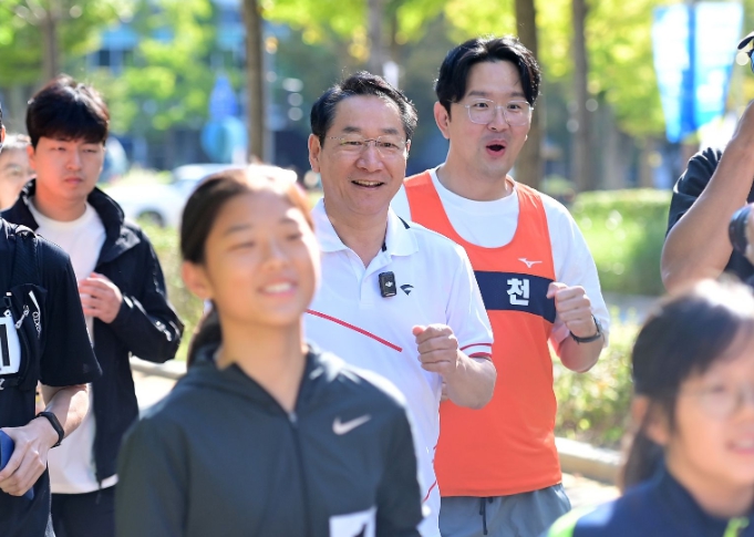 ▲ 유정복 인천광역시장이 9일 '건강도시 인천! 달려라!'에서 참가 시민들과 중앙공원 일대를 달리고 있다. |