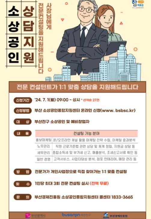 지원대상은 모집일 현재 부산진구 소재 사업장을 둔 소상공인이며 △홍보·마케팅 △노무관리 △세무·회계 △일반 경영관리 등 4개 분야에 대해 맞춤형 컨설팅을 지원한다.