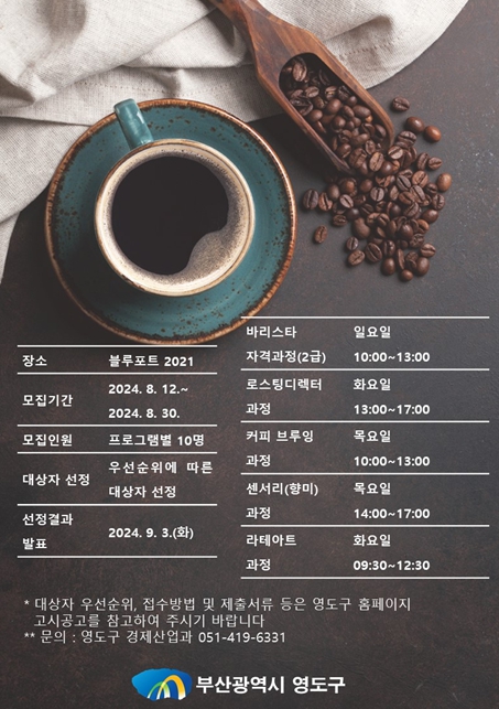 커피 전문가양성 프로그램은 로스팅 디렉터 과정, 커피 브루잉 과정, 센서리(향미) 과정, 라테아트 과정, 바리스타자격 과정 등 5개 전문 과정으로 구성됐다. 이번 프로그램은 교육과 함께 자격증 취득까지 예산이 지원되며, 영도구 소재 커피카페 경영자와 종사자, 예비창업자들을 대상으로 한 사람당 최대 2개 과정까지 신청할 수 있다.
