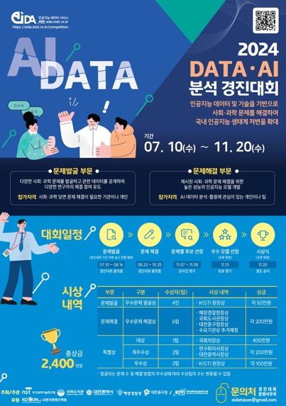 인공지능 데이터 및 기술을 기반으로 사회·과학 문제를 해결하고 국내 인공지능 생태계 저변을 확대하고자 추진되는 이번 대회의 수상자에게는 국회의장상, 중구청장상 등의 상장과 상금이 수여될 예정이며, 학술대회 발표와 후속 공동연구 기회도 제공된다.