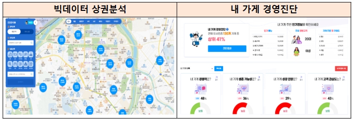 소상공인 365는 64개의 공공 및 민간 데이터를 수집, 22종으로 융합해 데이터의 품질과 범위를 확대*하고, ①빅데이터 상권분석, ②내 가게 경영진단, ③상권·시장 핫트렌드, ④정책정보 올가이드 등의 주요 서비스를 제공해 예비창업자와 소상공인의 데이터 기반 의사결정을 지원한다.