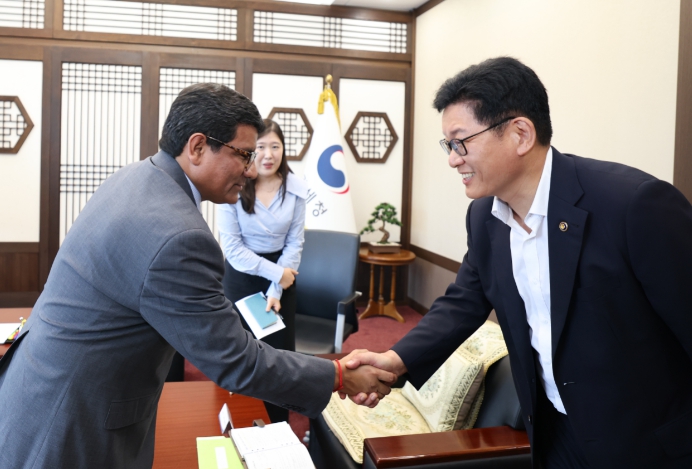 ▲ 고광효 관세청장(오른쪽)이 9일 서울세관에서 루이스 알베르또 하라미요 에콰도르 관세청장을 만나 인사를 나누고 있다. |