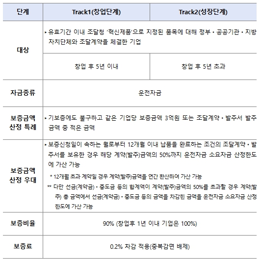 '혁신기업 전용 특례 보증'의 주요 특징은 다음과 같다. ①기존 보증과 관계없이 최대 3억원의 특례 보증을 지원하고, 이와 별도로 ②우대 특례를 도입하여 매출(조달계약서 등) 인정 비율을 기존 20~30%에서 최대 50%까지 확대 적용한다. 또한 ③보증비율도 현행 85%에서 90%까지 상향하고, ④보증료는 0.2%p 인하한다.