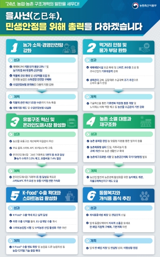 농식품부는 새해를 맞아 2024년의 성과와 점검을 바탕으로 2025년 주요 업무계획에 따라 올해도 디지털·세대·공간 3대 전환의 내실화를 착실하게 추진하고 농산물 생산 불안 등 반복되는 고질적 문제를 해소하여 민생 안정 노력의 체감도를 높여 나갈 계획이다.