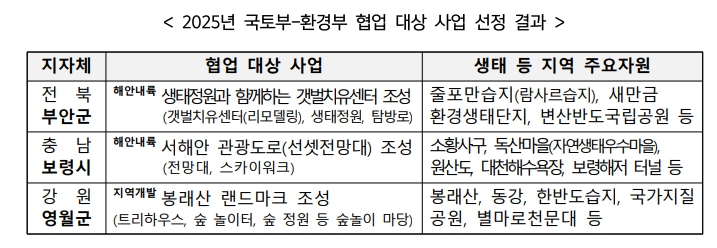 [뉴스서울] 국토교통부와 환경부는 ‘지속가능한 지역균형개발 및 생태관광 활성화 연계’ 협업 사업 대상지로 전북 부안군(생태정원 및 갯벌 치유센터), 충남 보령시(선셋전망대), 강원 영월군(봉래산 랜드마크) 등 3곳을 9월 1일자로 최종 확정한다.