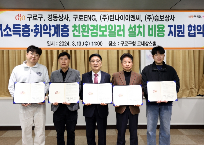 [뉴스서울] 구로구가 13일 구청 르네상스홀에서 저소득층과 취약계층의 친환경 보일러 설치 비용 지원을 위한 협약을 체결했다.