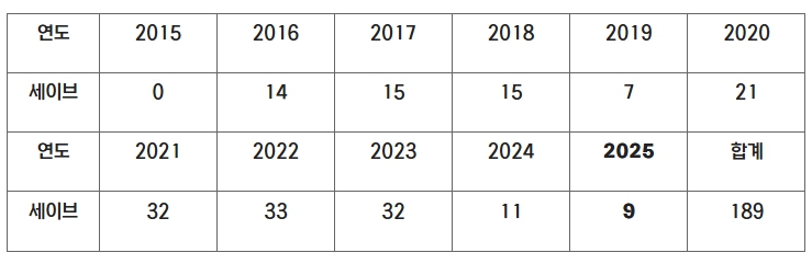 ▲ 삼성 김재윤 연도별 세이브 (2025. 8. 29 현재) |
