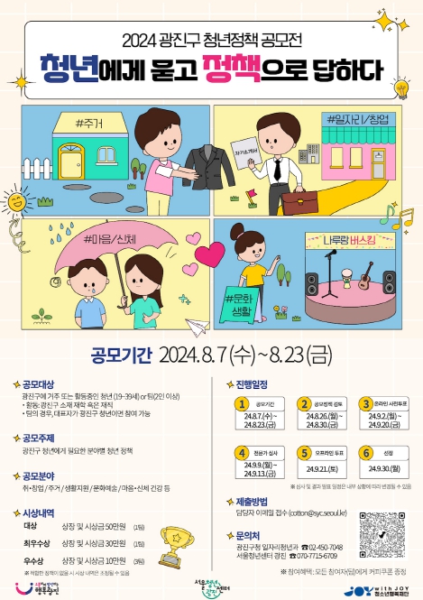 [뉴스서울] 광진구가 청년의 날(다음 달 21일)을 맞아, 광진구 청년에게 필요한 분야별 청년정책을 주제로 ‘2024년 청년정책 공모전’을 개최한다.