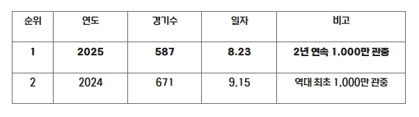 587경기만에 1,000만 관중을 달성하며, 역대 최초 1,000만 관중을 달성한 2024시즌 671경기만의 1,000만 관중 달성 기록을 84경기 단축했다.