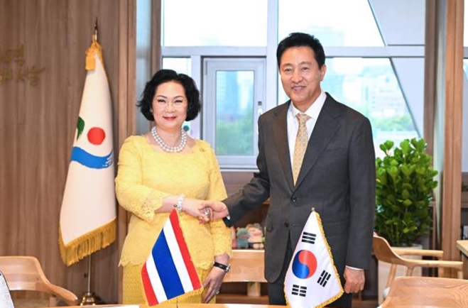 ▲ 오세훈 시장이 21일 오후 시장 집무실에서 쿠닝 파타마 리스와드트라쿨 국제올림픽위원회(IOC) 위원과 면담 전 사진 촬영을 하고 있다. |