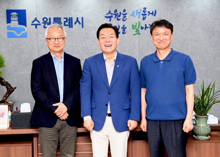 | ▲ 이재준 수원시장(가운데), 루크 리 하버드대 의과대학 교수(왼쪽), 조규진 성균관대 생명물리학과 교수가 간담회 후 함께하고 있다. |