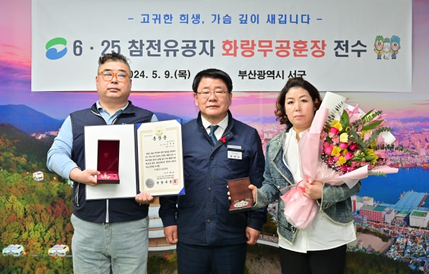 [뉴스서울] 부산 서구는 지난 9일 6·25전쟁에 참전해 공을 세운 故김행태 님의 조카 김주형 씨에게 화랑무공훈장을 전수했다.