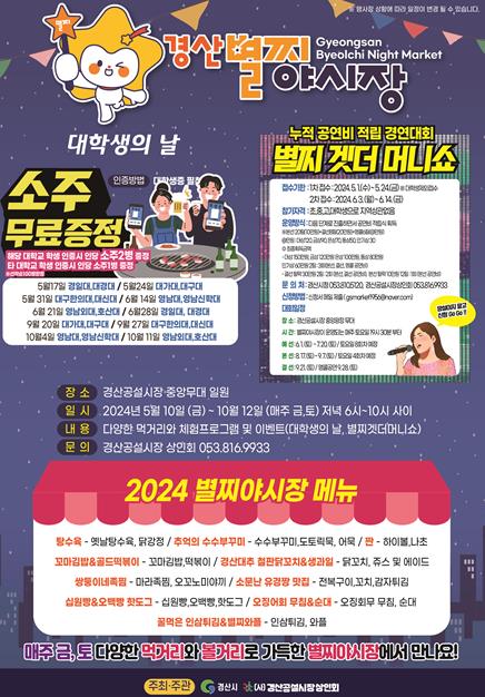 [뉴스서울] 경산시는 오는 10일 오후 6시에 경산공설시장 중앙광장에서 전통시장 활성화를 위한 ‘2024 경산별찌야시장’을 개장한다.