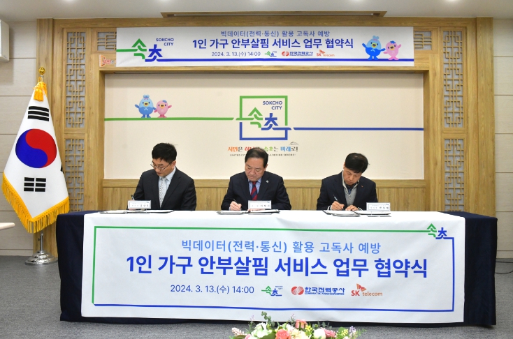 [뉴스서울] 속초시와 한국전력공사(속초고성지사장 박상현), SK텔레콤(AI사업부 부사장 김상목)은 13일 오후 2시 시청 상황실에서 고독사 예방 및 사회안전망 강화를 위한 '1인가구 안부살핌서비스'공동업무 협약식을 체결했다.