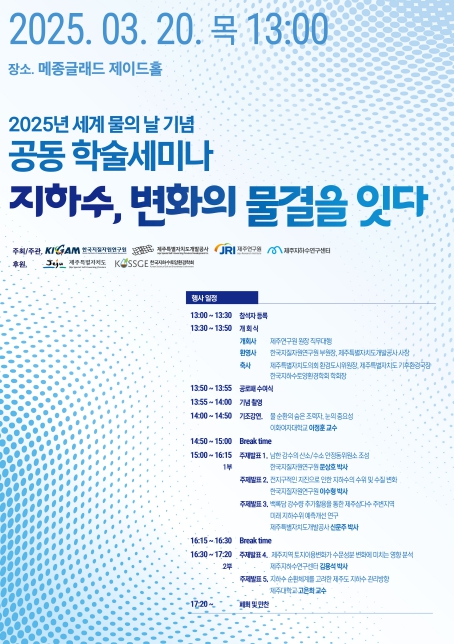 [뉴스서울] 제주연구원, 한국지질자원연구원, 제주특별자치도개발공사는 제주지하수의 보전・관리와 지속가능성을 위해 오는 20일, 제주 메종글래드 제이드홀(2F)에서 ‘2025 세계 물의 날 기념 공동학술세미나’를 개최한다.