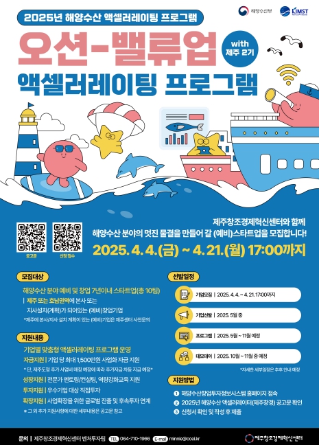 [뉴스서울] 제주창조경제혁신센터는 2025년 4월 4일부터 4월 21일 오후 5시까지 해양수산 분야의 예비창업자 및 창업 7년 이내 기업을 대상으로 '오션-밸류업 with jeju' 2기 참가기업 10개사를 모집한다고 밝혔다.