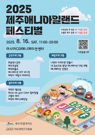 [뉴스서울] 제주특별자치도가 주최하고 (재)제주콘텐츠진흥원(원장 강민부)이 주관하는 2025 제주애니아일랜드 페스티벌이 오는 8월 16일 서귀포시 아시아CGI애니메이션센터에서 개최된다.