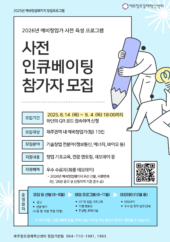 [뉴스서울] 제주창조경제혁신센터(대표이사 이병선)는 2025년 예비창업패키지 창업프로그램 ‘사전 인큐베이팅 프로그램'에 참여할 예비창업자를 모집한다고 26일 밝혔다.