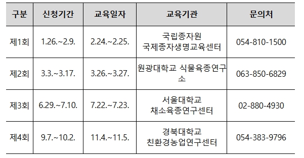 교육운영 방식은 전년도 교육 수료자들의 의견을 반영하여 집합(24일)과 온라인교육(25일)을 병행하여 운영되며 교육 신청자는 관련 세부 사항 및 일정(교육신청: 1.26~2.9)을 국제종자생명교육센터 누리집에서 확인할 수 있다.