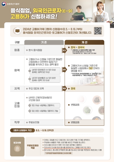 농식품부 양주필 식품산업정책관은 “3회차 고용허가 신청부터 변경된 신청 요건에 따라 더 많은 음식점업에서 고용허가를 신청할 수 있게 됐다.”라면서, “사업주가 반드시 알아야 할 사항을 중심으로 사전 교육을 무료로 제공하니, 꼭 수강하여 고용허가 신청과 외국인 고용관리에 도움받으시길 바란다.”라고 밝혔다.
