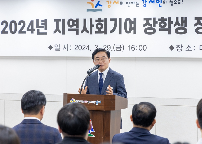 ▲ 진교훈 서울 강서구청장이 29일(금) 오후 4시 구청 대회의실에서 열린 ‘2024년 지역사회기여 장학생 장학증서 수여식’에 참석해 인사말을 하고 있다. |